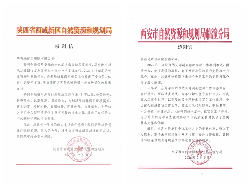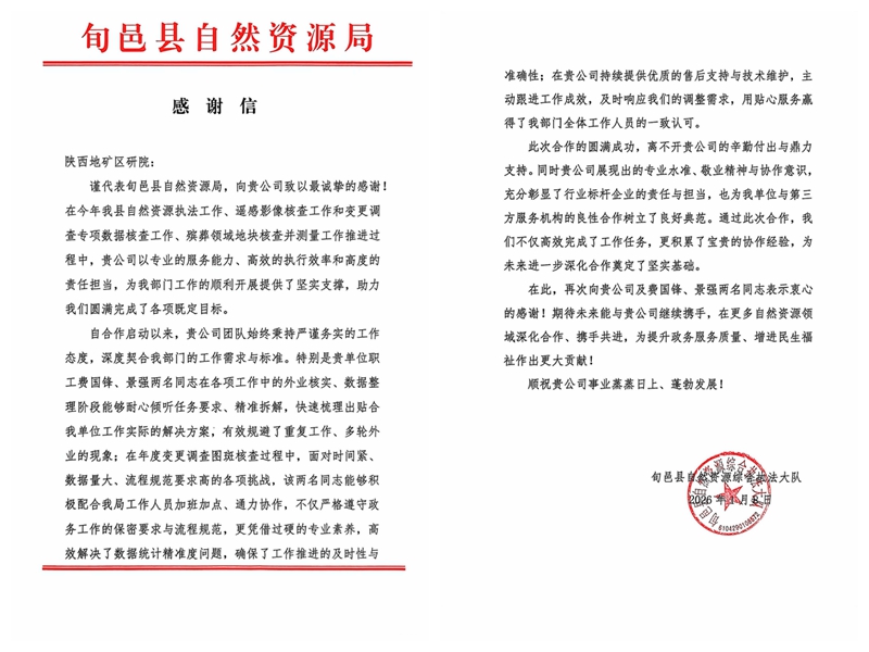 新春將至,3S國(guó)土勘測(cè)規(guī)劃事業(yè)部收到西安、咸陽(yáng)、西咸新區(qū)等多家自然資源和規(guī)劃部門的感謝信,對(duì)事業(yè)部過(guò)去一年在自然資源領(lǐng)域給予的專業(yè)支持與卓越貢獻(xiàn)表達(dá)誠(chéng)摯謝意,也彰顯了事業(yè)部與自然資源和規(guī)劃部門攜手共進(jìn)、協(xié)作共贏的深厚合作情誼。