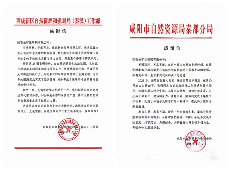 新春將至,3S國(guó)土勘測(cè)規(guī)劃事業(yè)部收到西安、咸陽(yáng)、西咸新區(qū)等多家自然資源和規(guī)劃部門的感謝信,對(duì)事業(yè)部過(guò)去一年在自然資源領(lǐng)域給予的專業(yè)支持與卓越貢獻(xiàn)表達(dá)誠(chéng)摯謝意,也彰顯了事業(yè)部與自然資源和規(guī)劃部門攜手共進(jìn)、協(xié)作共贏的深厚合作情誼。